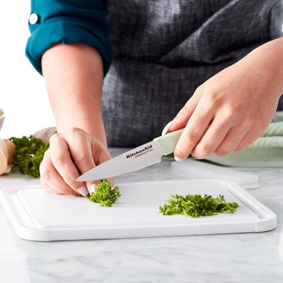 - CUTLERY ESSENTIALS: This KitchenAid Classic 4-piece chef knife set includes all the essential knives needed to perform everyday food prep tasks such as slicing, cutting, chopping, mincing, trimming, and more. Use the 6-inch chef knife to chop, the 5-inch santoku knife to dice and mince, the 5.5-inch serrated utility knife to cut through delicate crust, and 3.5-inch paring knife to peel, trim and garnish small fruits and vegetables.