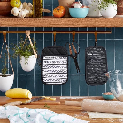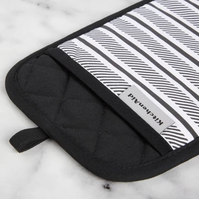Use the KitchenAid Albany Pot Holders 2-Pack in Aqua Sky to protect your hands from the heat when handling hot pots, pans, and dishes. These matching pot holders each measure 7 inches wide by 10 inches long and feature a slide pocket for your hand for easy on-and-off use. The heavy-duty, 100% cotton fabric offers comfort, flexibility, and insulation. Printed silicone grips are heat resistant and ensure a more secure grip. This set is machine washable for easy care.