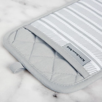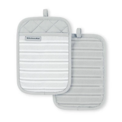 Use the KitchenAid Albany Pot Holders 2-Pack in Aqua Sky to protect your hands from the heat when handling hot pots, pans, and dishes. These matching pot holders each measure 7 inches wide by 10 inches long and feature a slide pocket for your hand for easy on-and-off use. The heavy-duty, 100% cotton fabric offers comfort, flexibility, and insulation. Printed silicone grips are heat resistant and ensure a more secure grip. This set is machine washable for easy care.