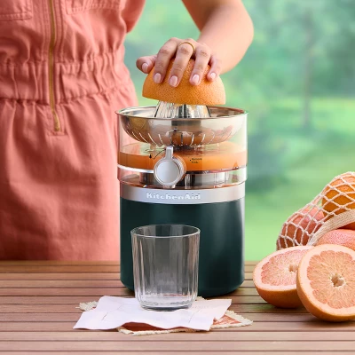 The power to make. The power to move. Create anywhere using the KitchenAid Go™ Cordless Citrus Juicer with 16 oz reservoir bowl. Powered by a rechargeable 12v MAX removable battery*, the new cordless citrus juicer delivers up to 3 hours of continuous run time**. With an Auto-Reversing Reamer and Precision Pour spout, this juicer lets you add fresh citrus to breakfast, recipes, cocktails, mocktails and more. Bring a fresh take to taking fresh squeezed juice anywhere. * Sold separately. **Maximum initial battery voltage (measured without a workload) is 12 volts. Nominal voltage is 10.8 volts. Actual run time will vary based on recipe used. Battery life impacted by factors such as battery age and use.
