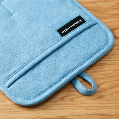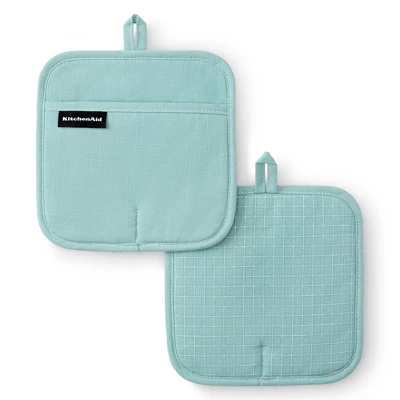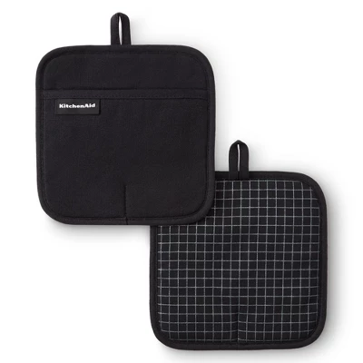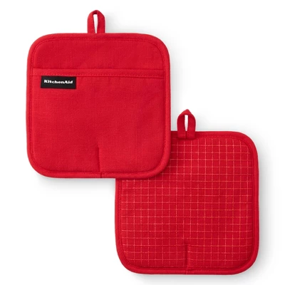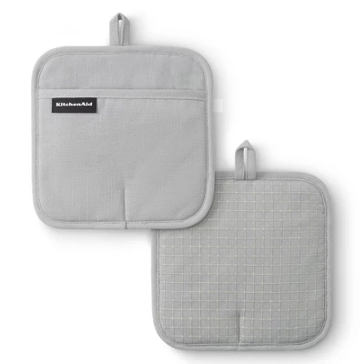 Protect your hands with the KitchenAid Gourmet Series Gridlines Pot Holder 2-Pack Set. Heat resistant up to 600°F, these potholders feature slip-resistant silicone grips with a windowpane grid design, extra-thick padding for added protection, and a 100% cotton exterior with polyester lining. Designed for convenience, they include magnets and hanging loops for easy storage and are machine washable for hassle-free cleaning. Stylish and functional, they’re perfect for any kitchen task. Coordinate with KitchenAid kitchen linens and tools for a cohesive look.