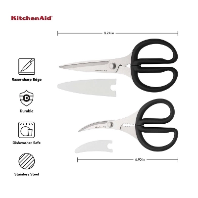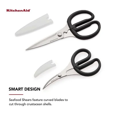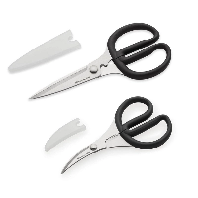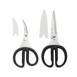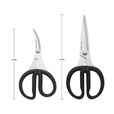 This 2 piece shear set meets all your needs in the kitchen with an all purpose and seafood shear. Made of sharp 420 J2 stainless steel blades with TPE soft grip handles for comfort and control. Microserrations on the blade edge provide a superior cutting experience on everything from tough cuts of meat to strong wires and twines Includes protective blade covers to protect blades for storage. Hand wash in warm, soapy water and dry immediately.